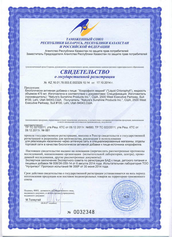 Свидетельство о государственной регистрации Презентация Хлорофилл жидкий